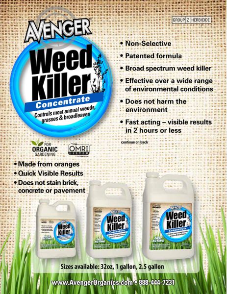 PDF Frequently Asked Questions What is Avenger Weed Killer? How does ... Avenger Weed Killer is a fast-acting, post-emergence herbicide for use on weeds that already exist. It will not control weeds that have yet to germinate. Where can I use Avenger Weed Killer? Avenger Weed Killer is EPA registered for use in non-crop areas such as borders, around mature trees and ornamentals, around buildings, in greenhouses ... Avenger Weed Killer Concentrate - DoMyOwn.com Avenger Weed Killer Concentrate is a great solution for those looking for environmentally safe herbicides. This product is a non-selective herbicide, made from the rind of oranges to control most annual grasses, weeds and broadleaves. PDF Precautionary Statements Hazards to Humans and Domestic Animals Product information: Avenger Weed Killer is a broad spectrum weed killer that contains a citrus extract called d-limonene. D-limonene comes from the peel of oranges. It is non-selective and controls most annual weeds, both grasses and broadleaves. Avenger Weed Killer is fast acting with quick visible results.