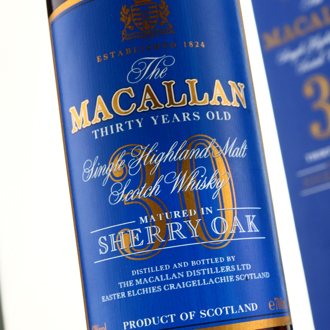 The Macallan 30 Years Old Blue Label - Le Bon Intern... Description:A famous old expression of The Macallan 30 year old, matured entirely in sherry oak casks. This was the last edition of the sherried 30yo before the introduction of the Fine Oak series, and also the last 30yo before Macallan revamped their bottle shape and packaging, ditching the wooden boxes for 25yo and 30yo.
